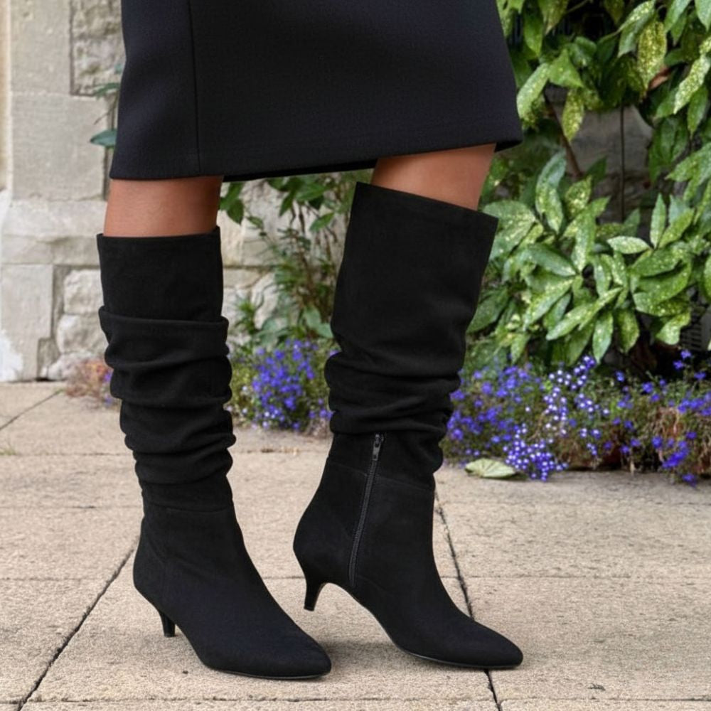 These elegant black nubuck suede slouch boots feature an extra-wide toe box and cushioned memory foam insoles for superior comfort. Perfect for both everyday outings and special occasions, they are finished with a refined 4cm kitten heel for a subtle lift.