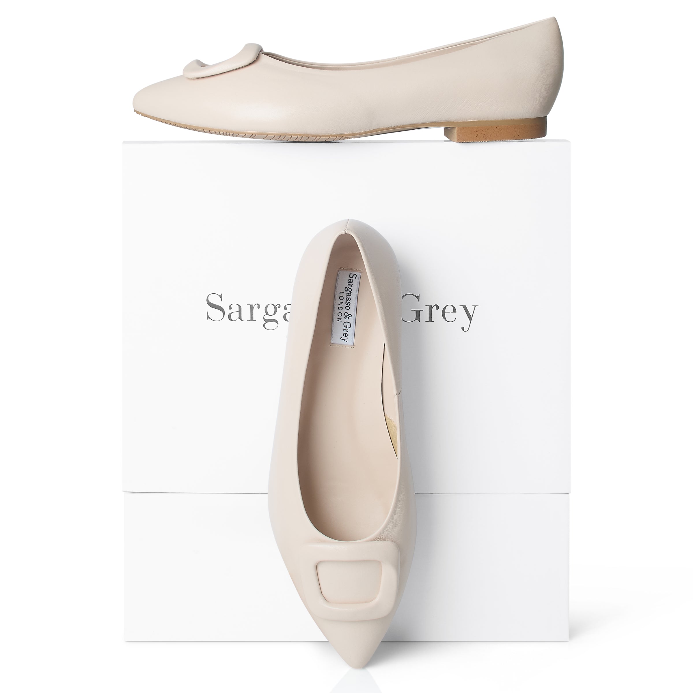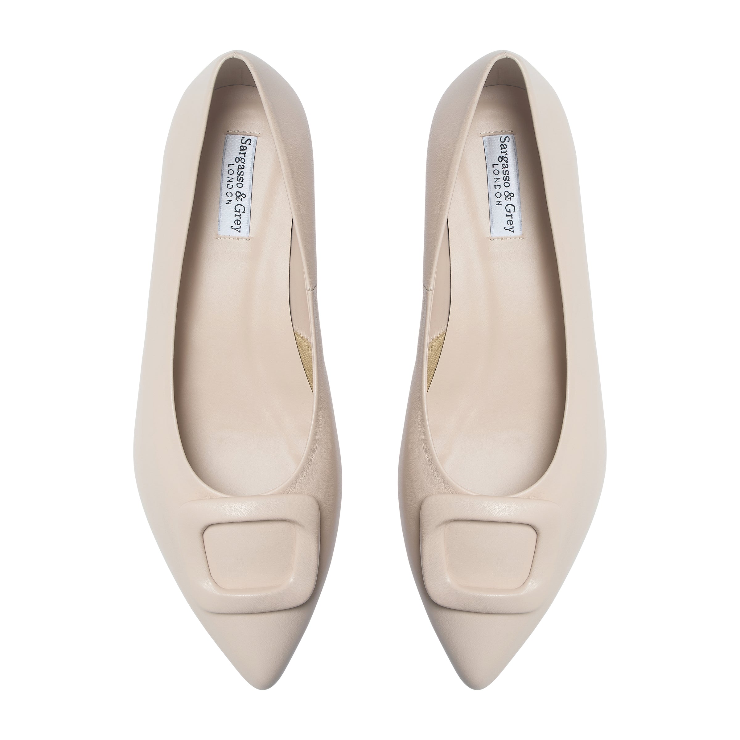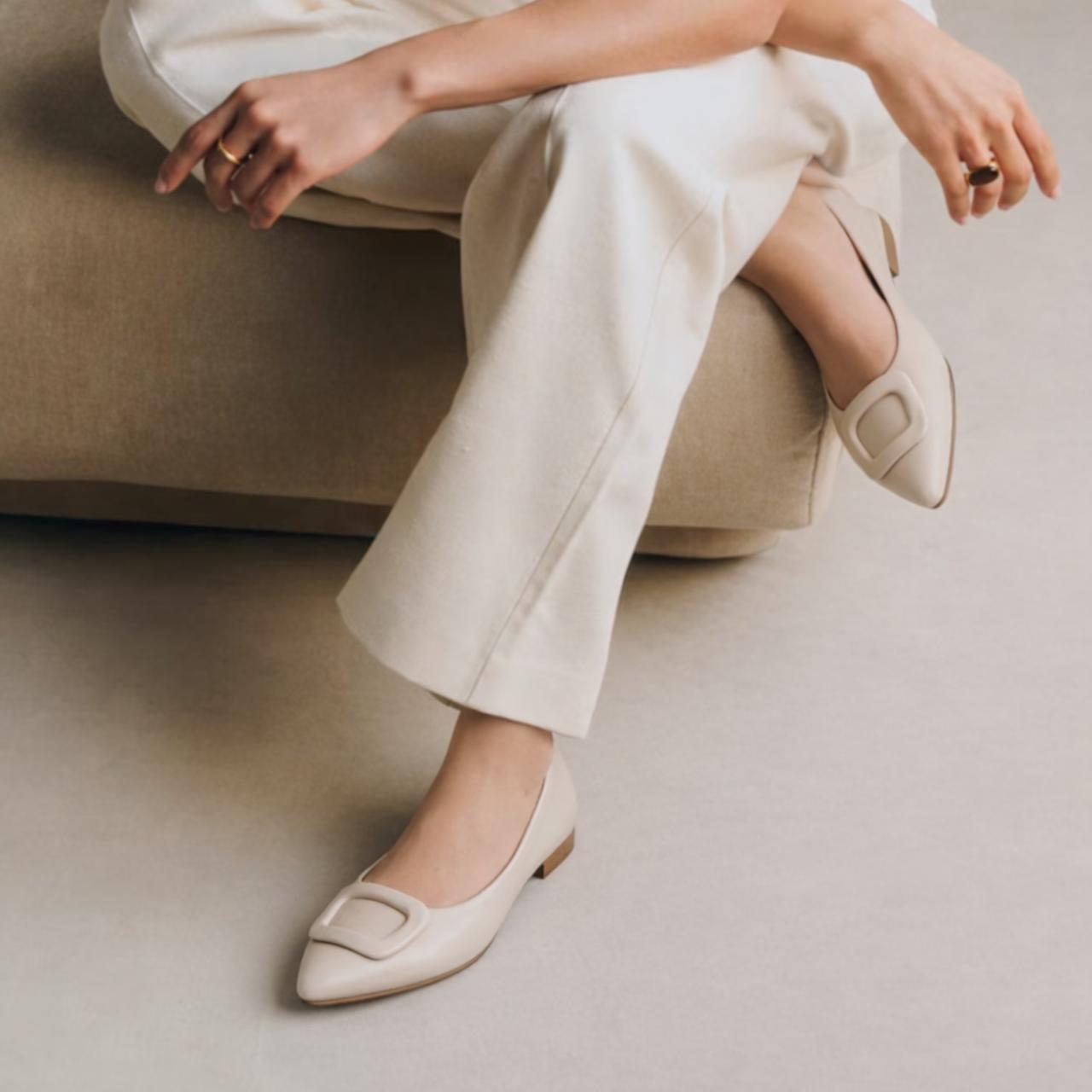 Veronica, a sophisticated pointed flat designed specifically for those who require extra room and support without compromising on style. Beautifully crafted from buttery-soft almond leather with an elegant oversized, leather-wrapped buckle detail, providing a chic, tonal texture.