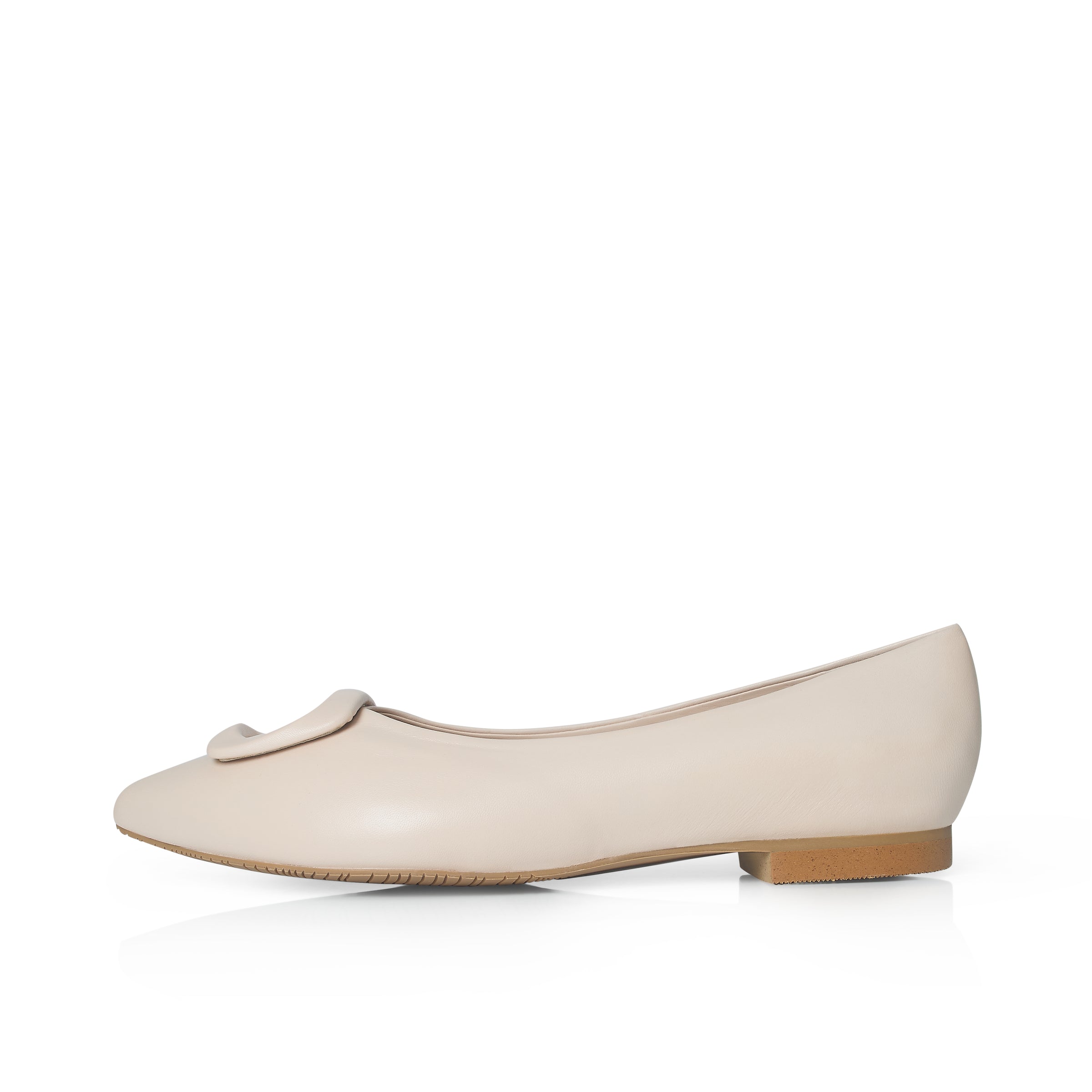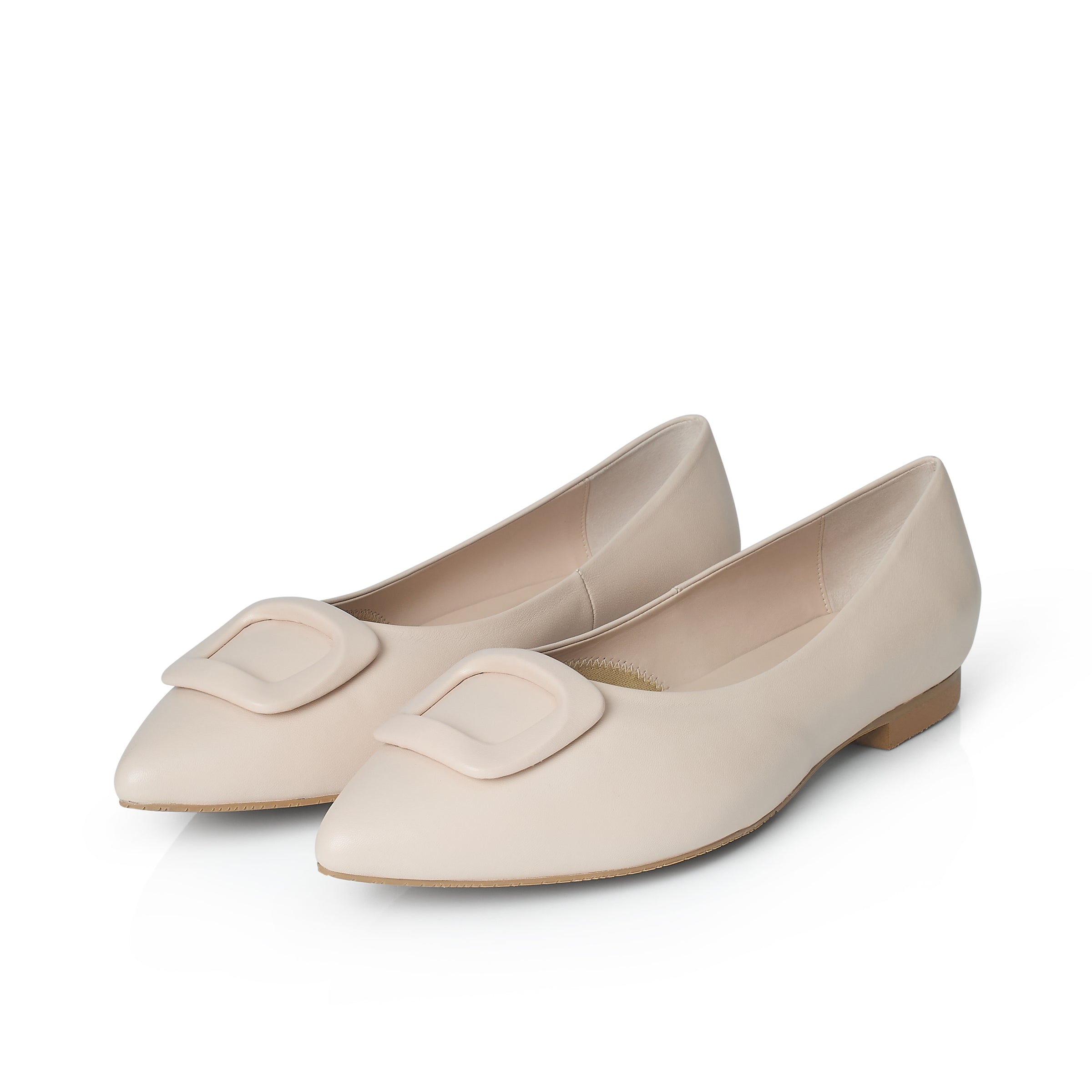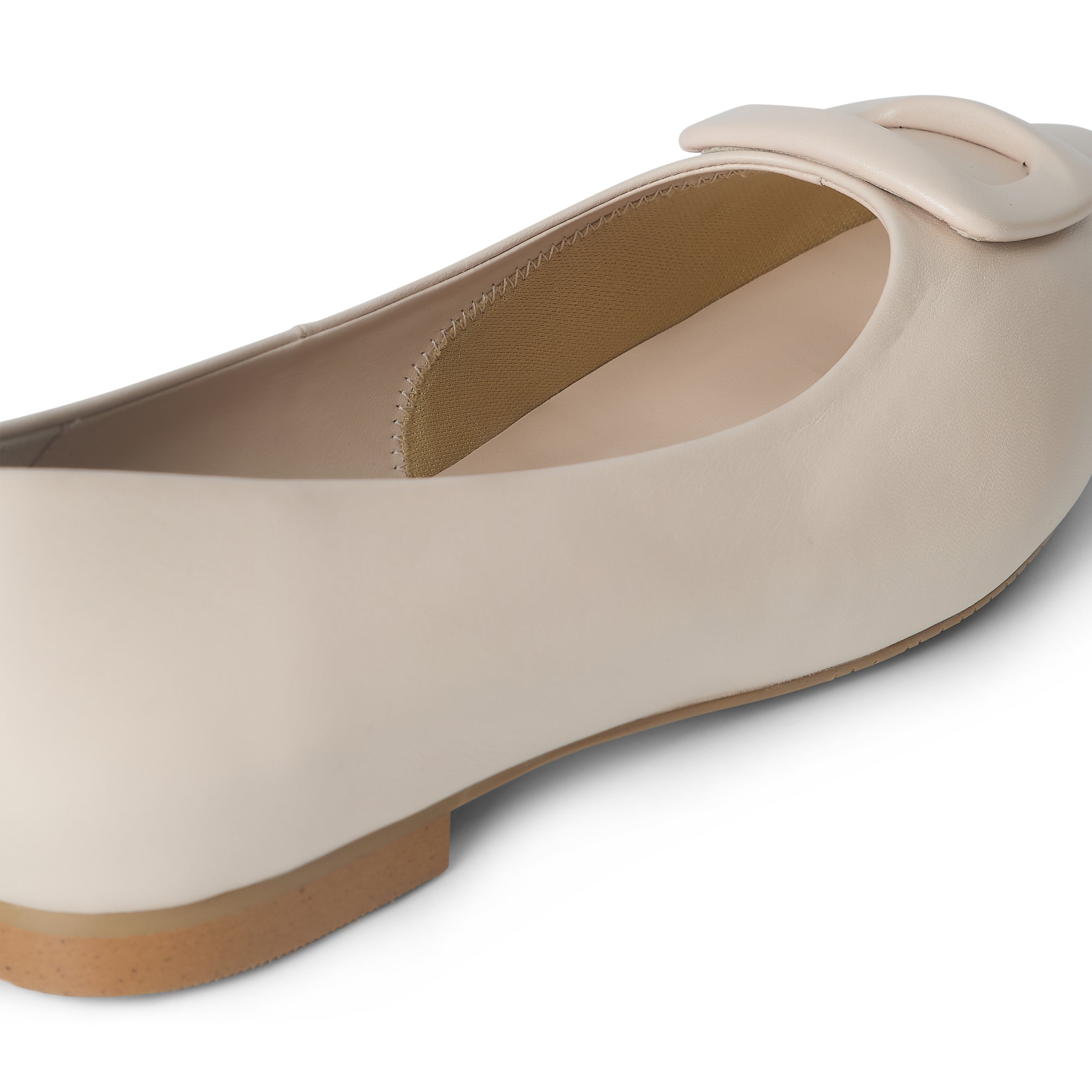 Veronica, a sophisticated pointed flat designed specifically for those who require extra room and support without compromising on style. Beautifully crafted from buttery-soft almond leather with an elegant oversized, leather-wrapped buckle detail, providing a chic, tonal texture.