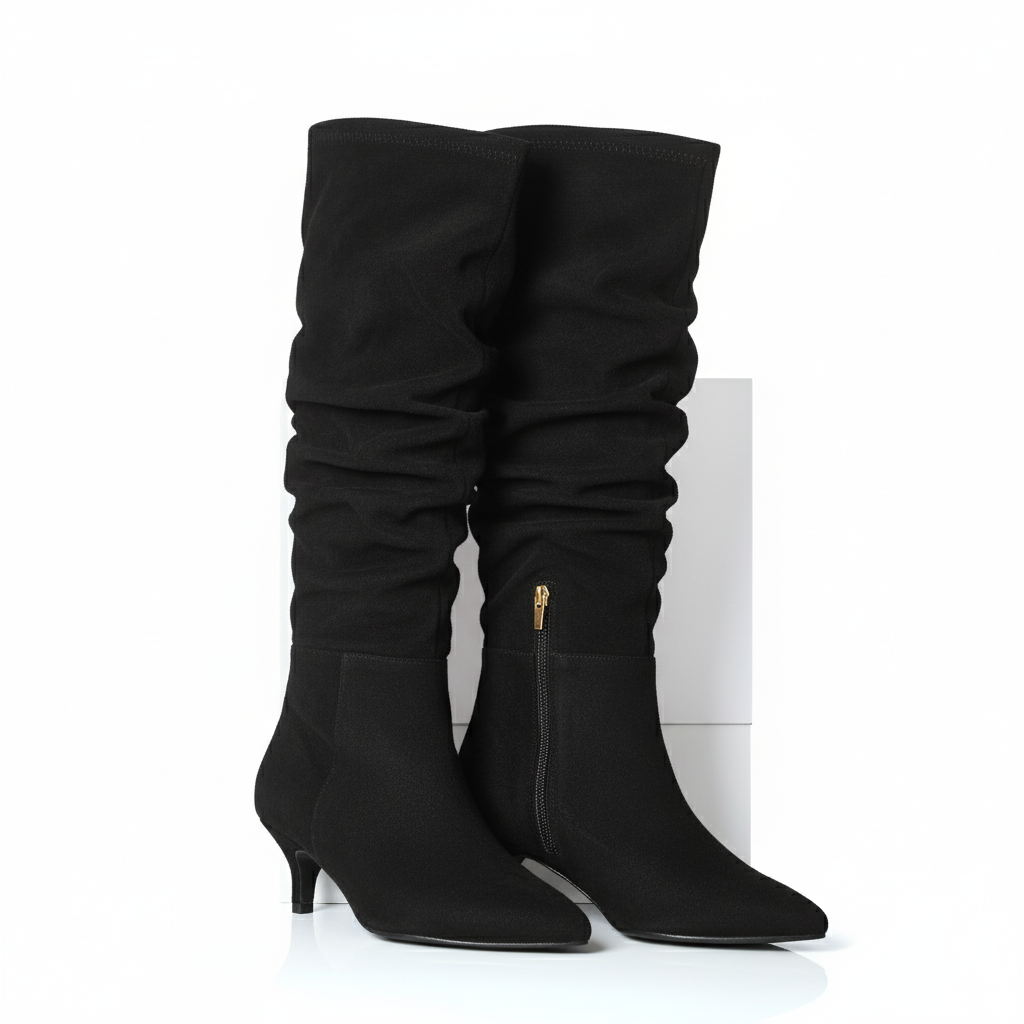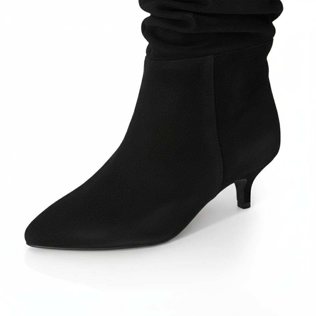 These elegant black nubuck suede slouch boots feature an extra-wide toe box and cushioned memory foam insoles for superior comfort. Perfect for both everyday outings and special occasions, they are finished with a refined 4cm kitten heel for a subtle lift.