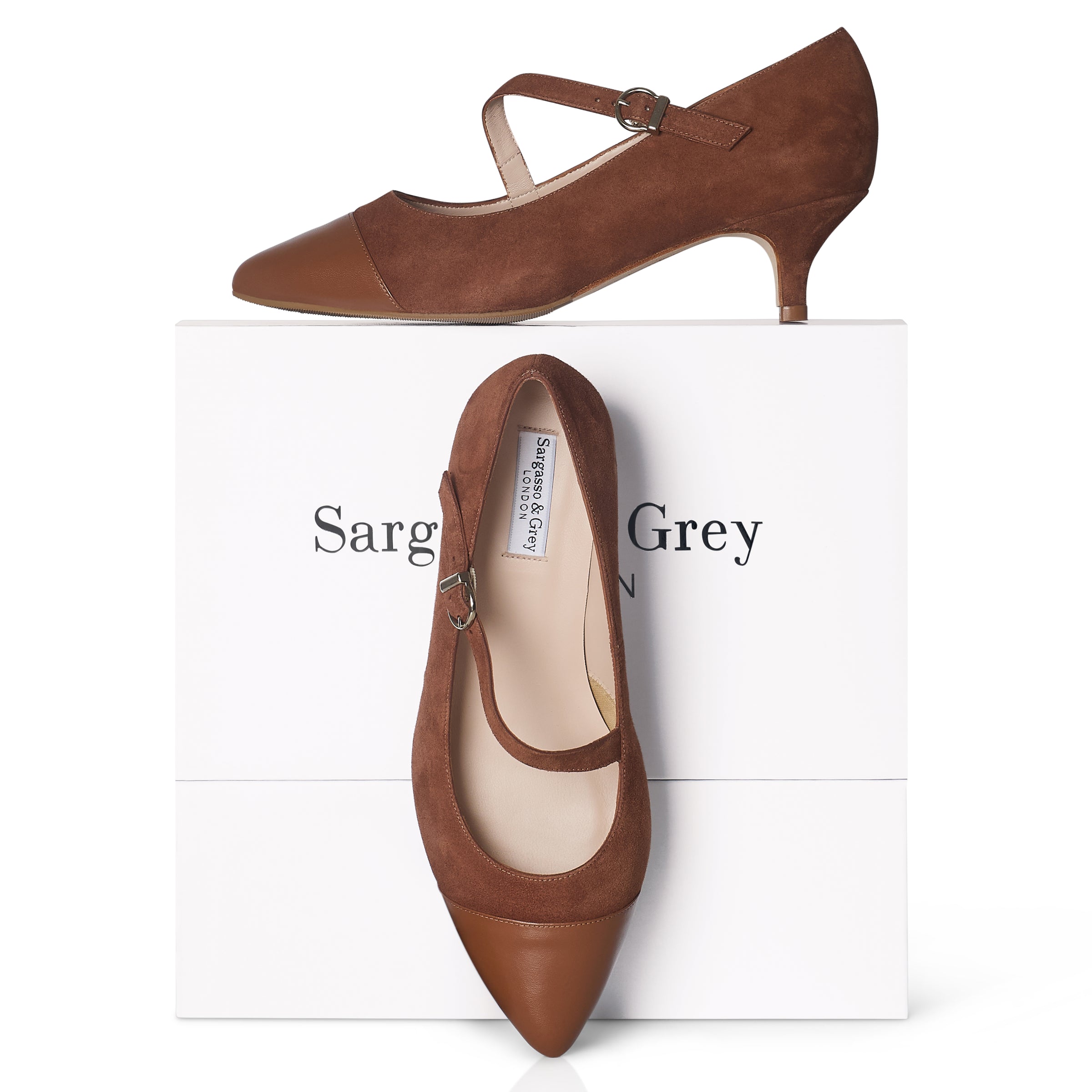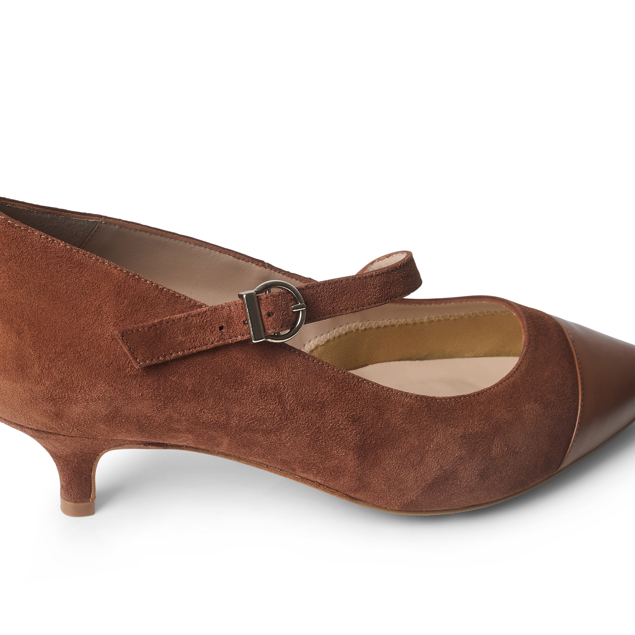 Introducing the Ally Extra-Wide Fit Heels in sumptuous tan suede. These refined kitten heels marry contemporary design with exceptional comfort, featuring a striking contrast leather toe cap and an elegantly angled buckle strap for a modern aesthetic. Crafted with a generously proportioned toe box, they incorporate our signature Smooth & Soothe hidden foam panel—a discreet cushioning system designed to accommodate bunions and tender toes with grace. Experience the perfect balance of style and ease, where irritation becomes a thing of the past and comfort reigns supreme.