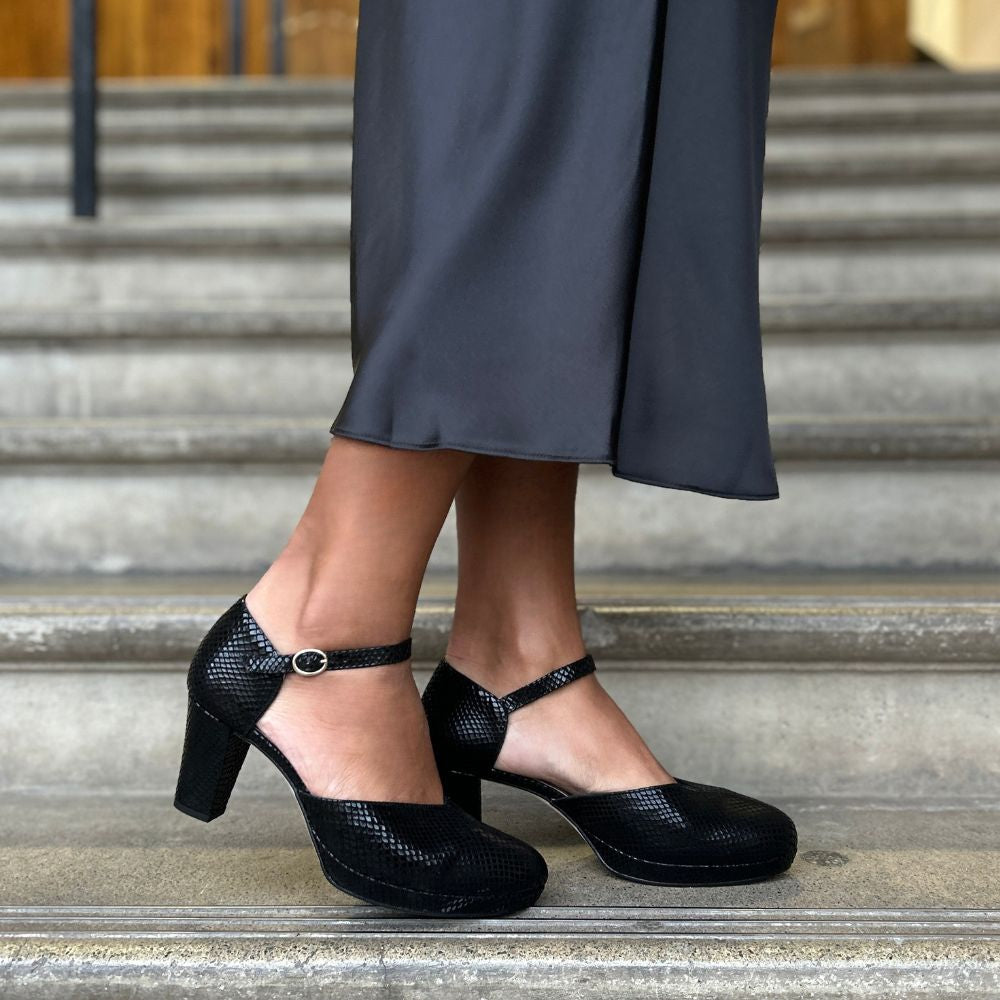 Mika Wide Fit Platform Heels - Black Snake-Effect Suede